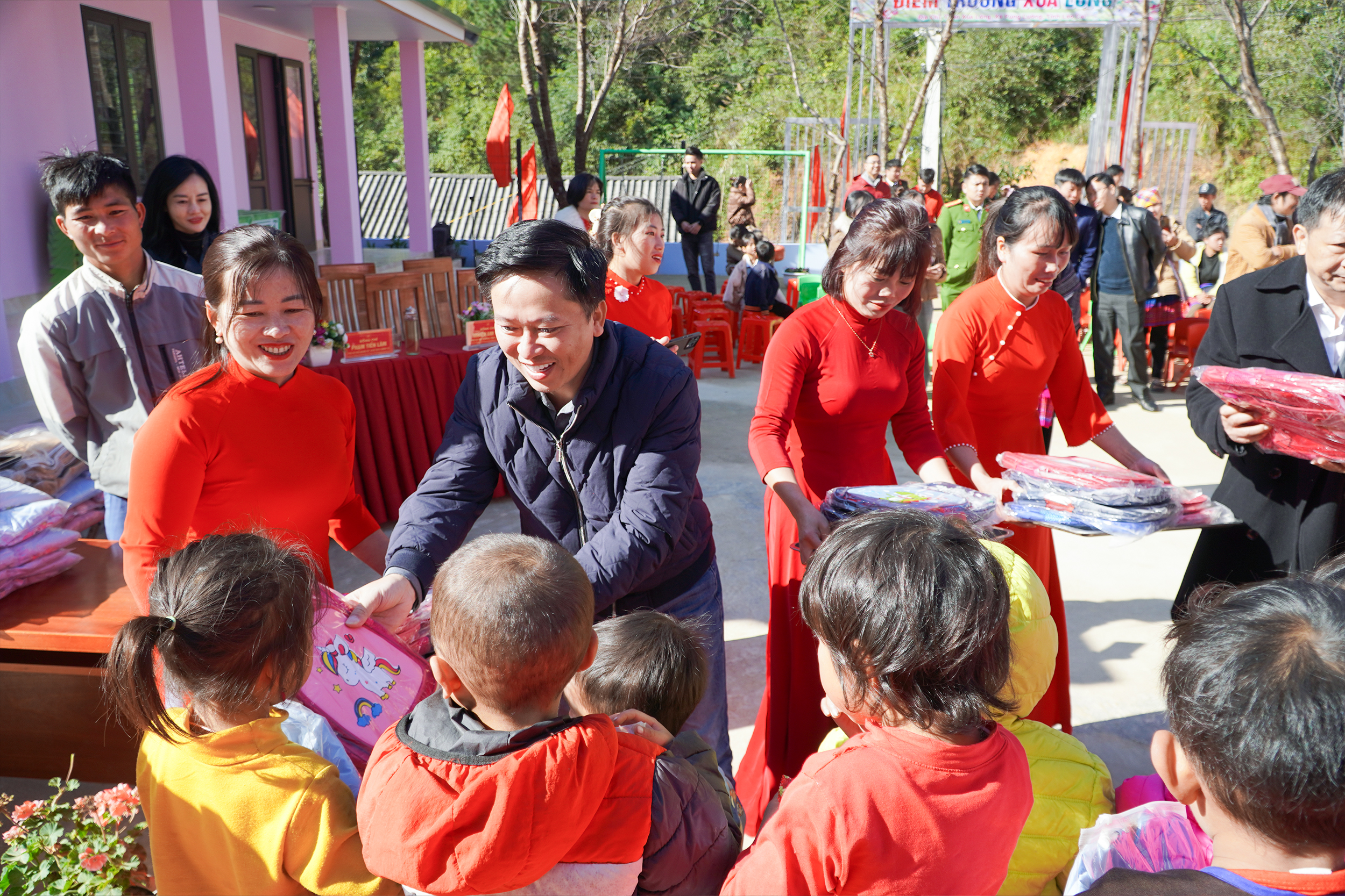 Cùng với việc bàn giao công trình, đoàn thiện nguyện còn chuẩn bị những món quà nhỏ khác: áo ấm, balo học tập, chăn ấm, bánh kẹo… gửi đến các em nhỏ.